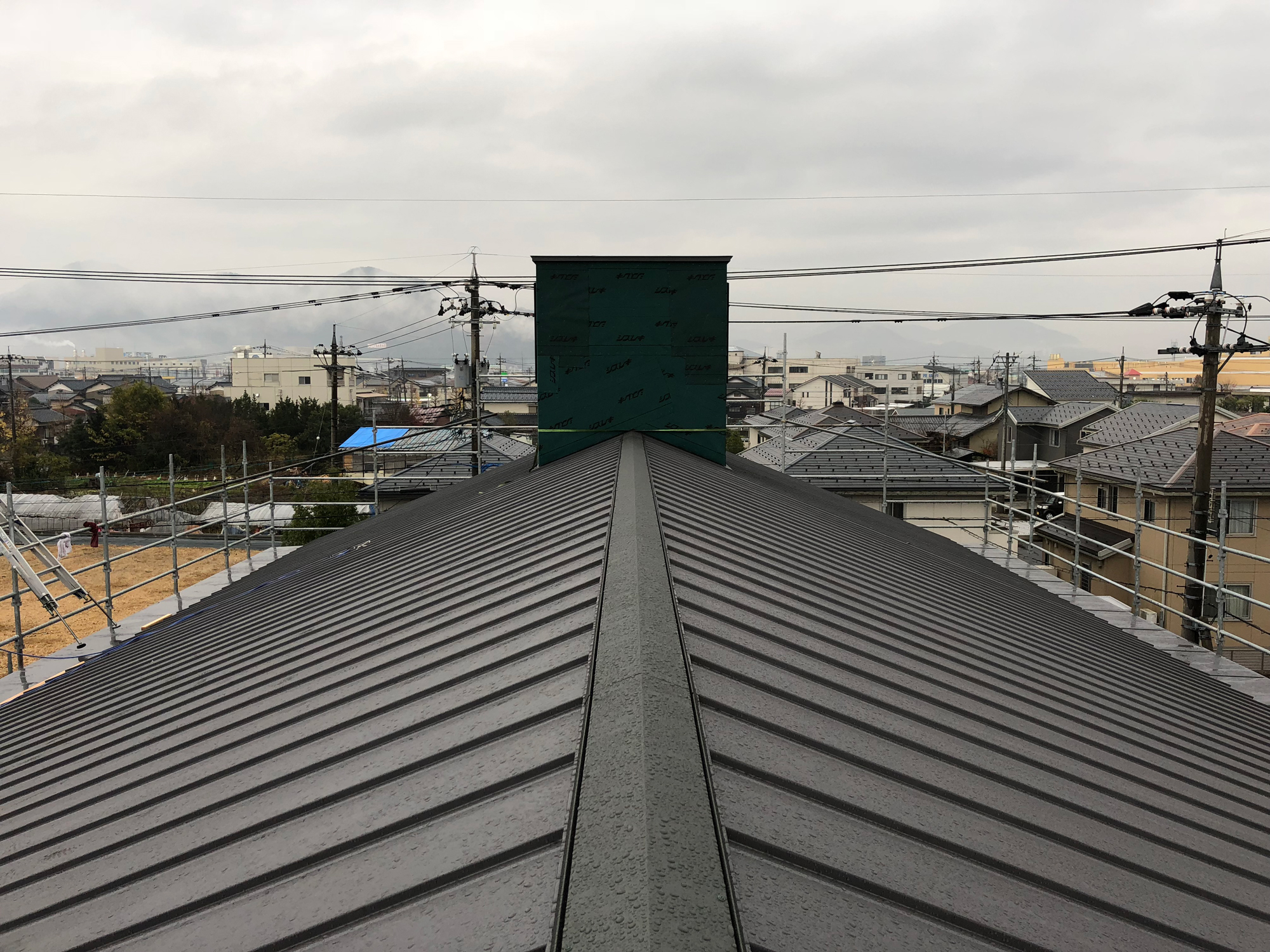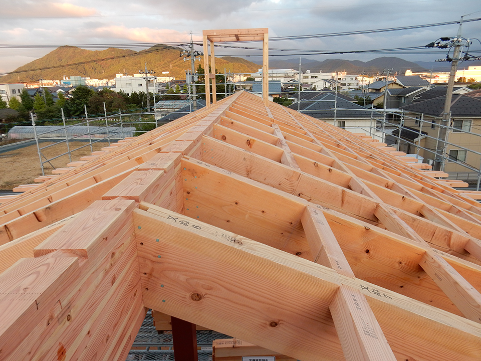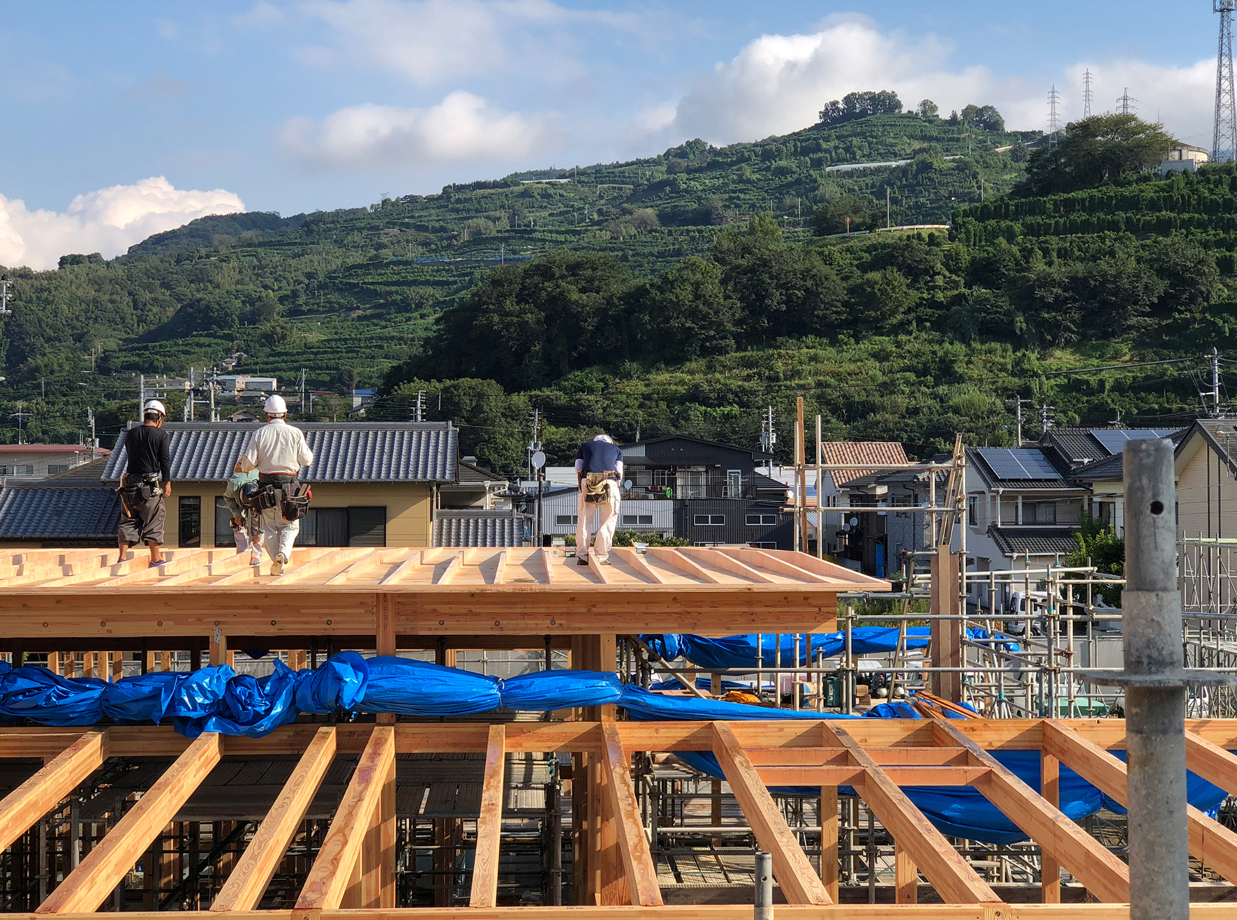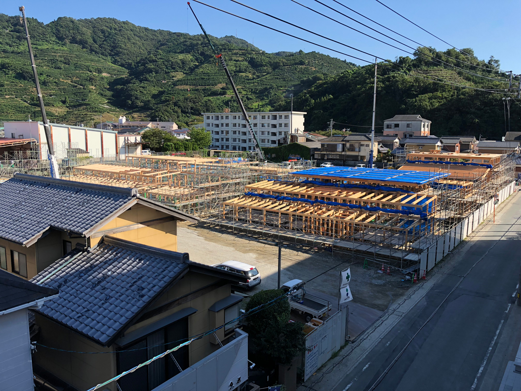 八幡浜では、いよいよ建て方が始まりました。写真は、周囲のみかんの段畑をバックに、大屋根の垂木を取り付けている大工さんたちです。