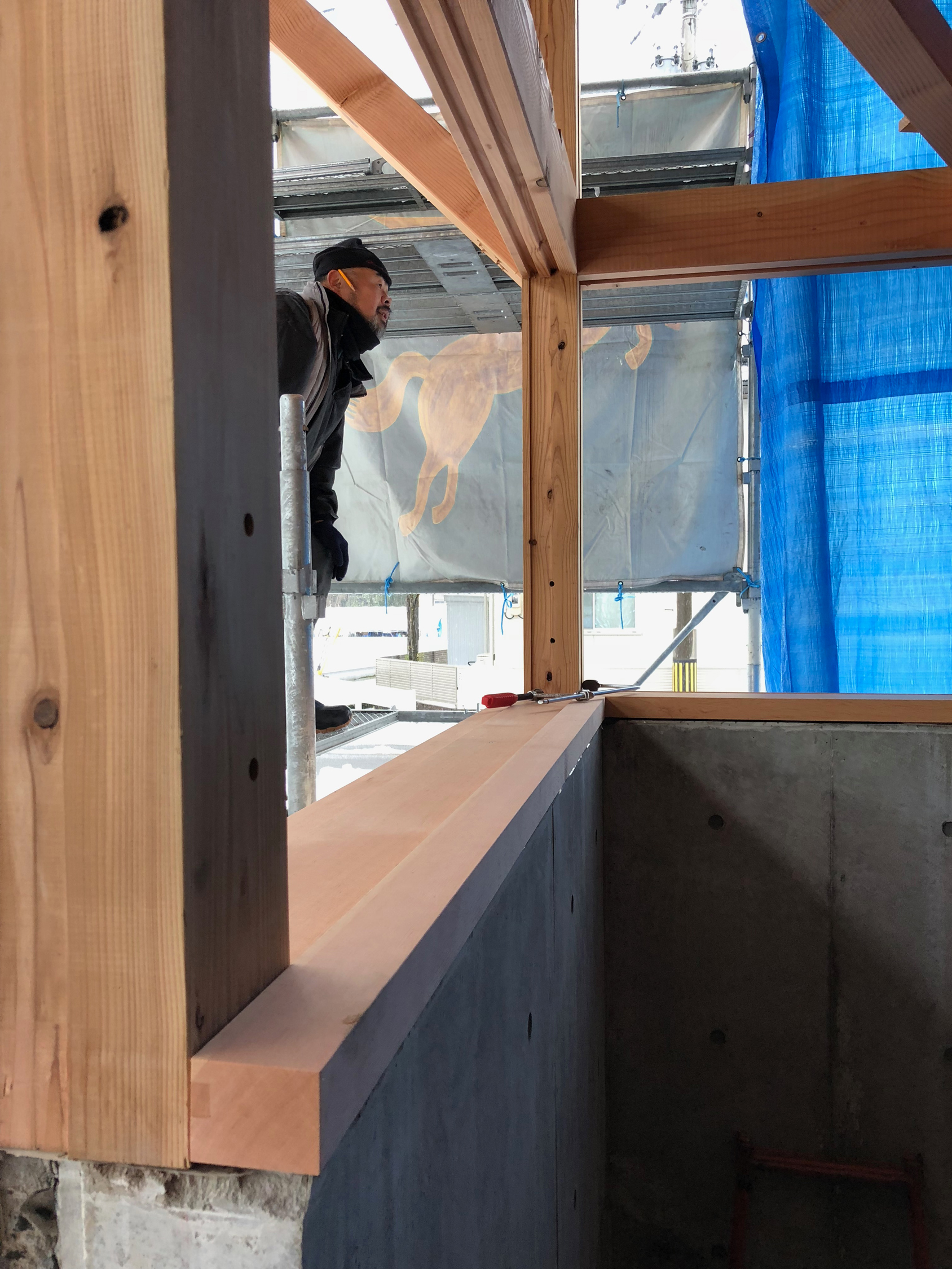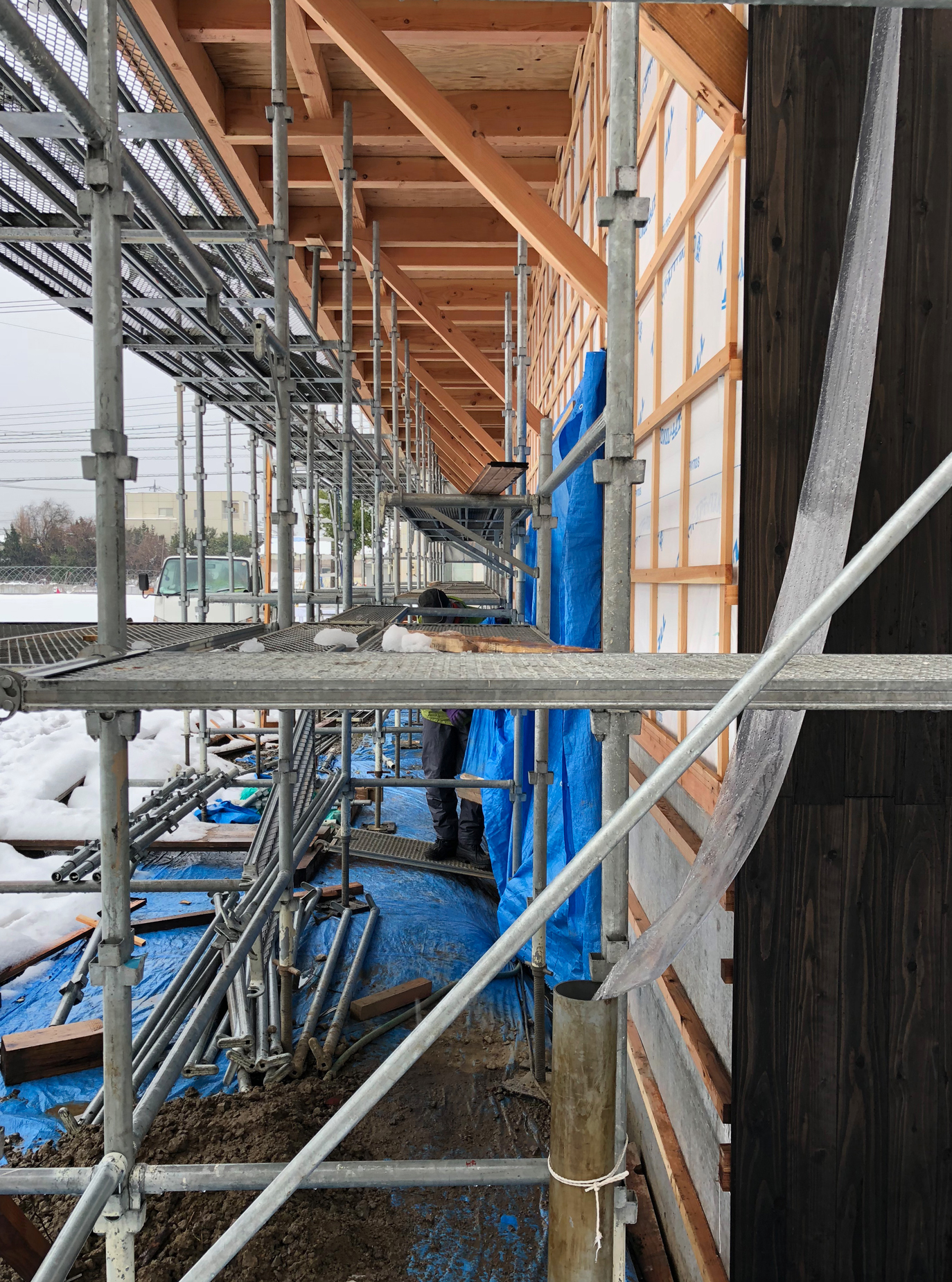 外部の工事はおおよそ仕上がってきていて、内装の工事が進んできています。柱・梁に直接納められたガラスもうまく納まり、ほぼすべての軸組が現しの空間が現れてきました。今後、床貼りや家具工事が進んで行きます。それにしても、北陸の職人さんは当たり前ですが雪に慣れていて、車にスコップ常備。ちょっと打ち合わせしている間にも車は雪に埋まってしまうので、スコップで除雪してから出ないと車に乗れません。足元は長靴当たり前。以前、雪の時にスニーカーで現場に行ったら、職人さんに笑われてしまったので、今回はスノーブーツを装着。「おっ、今日はブーツだね。」とニッコリしていただけました。月末には、足場が外れるそうです。たのしみ!