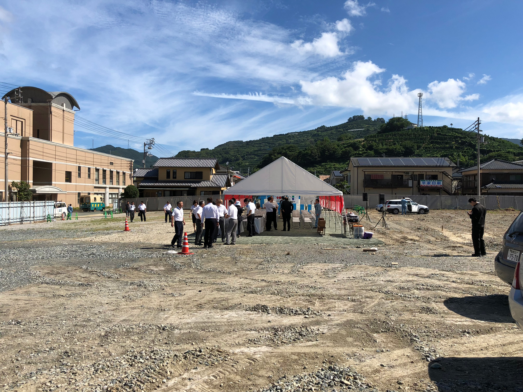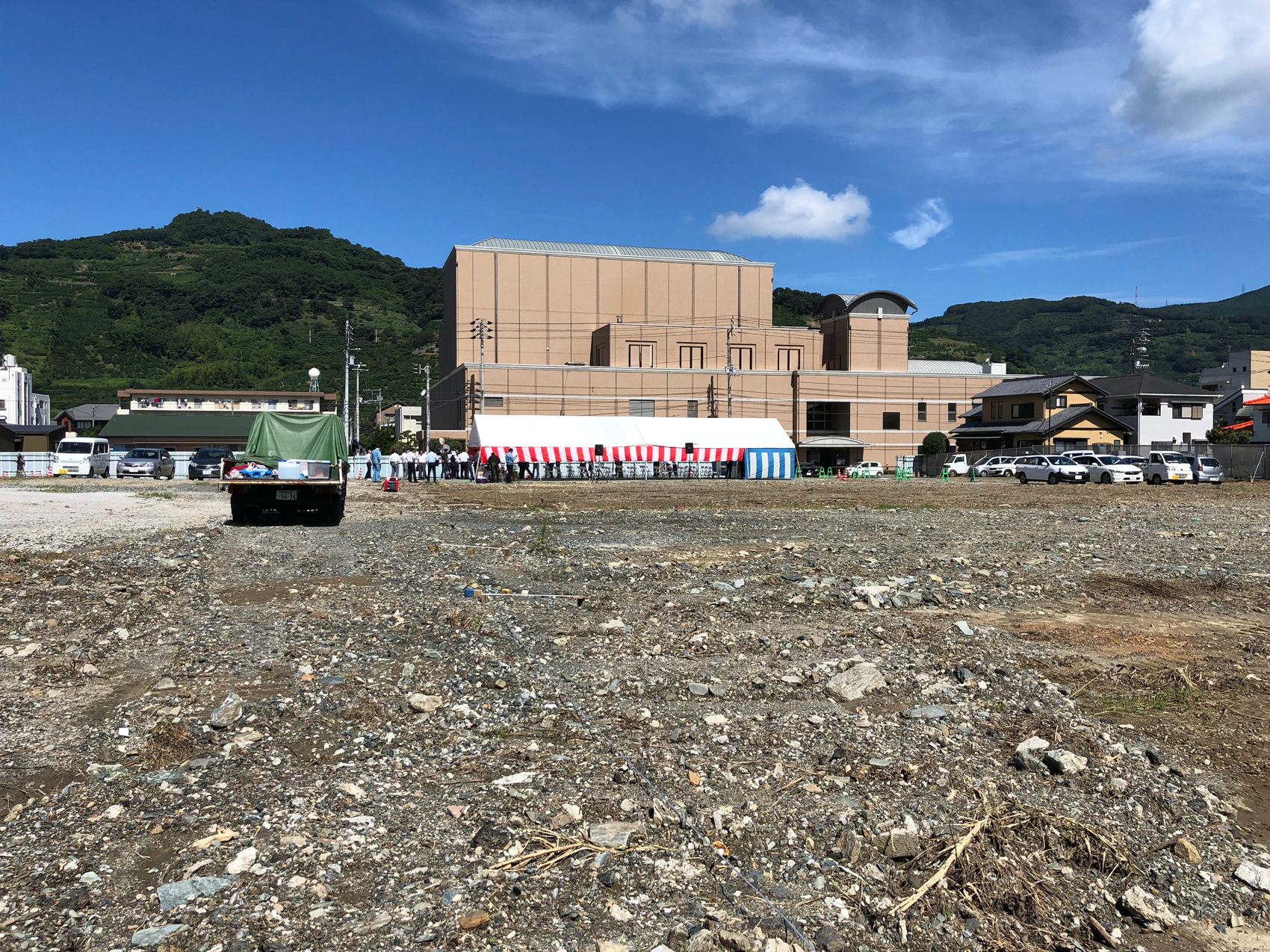 それにしても6000㎡の敷地は広い!奥に見えるみかんの段畑と呼応するように、段々屋根の平屋の建物がこの場所に建つ予定です。(地元のCATVで放送された起工式の様子はこちらから)