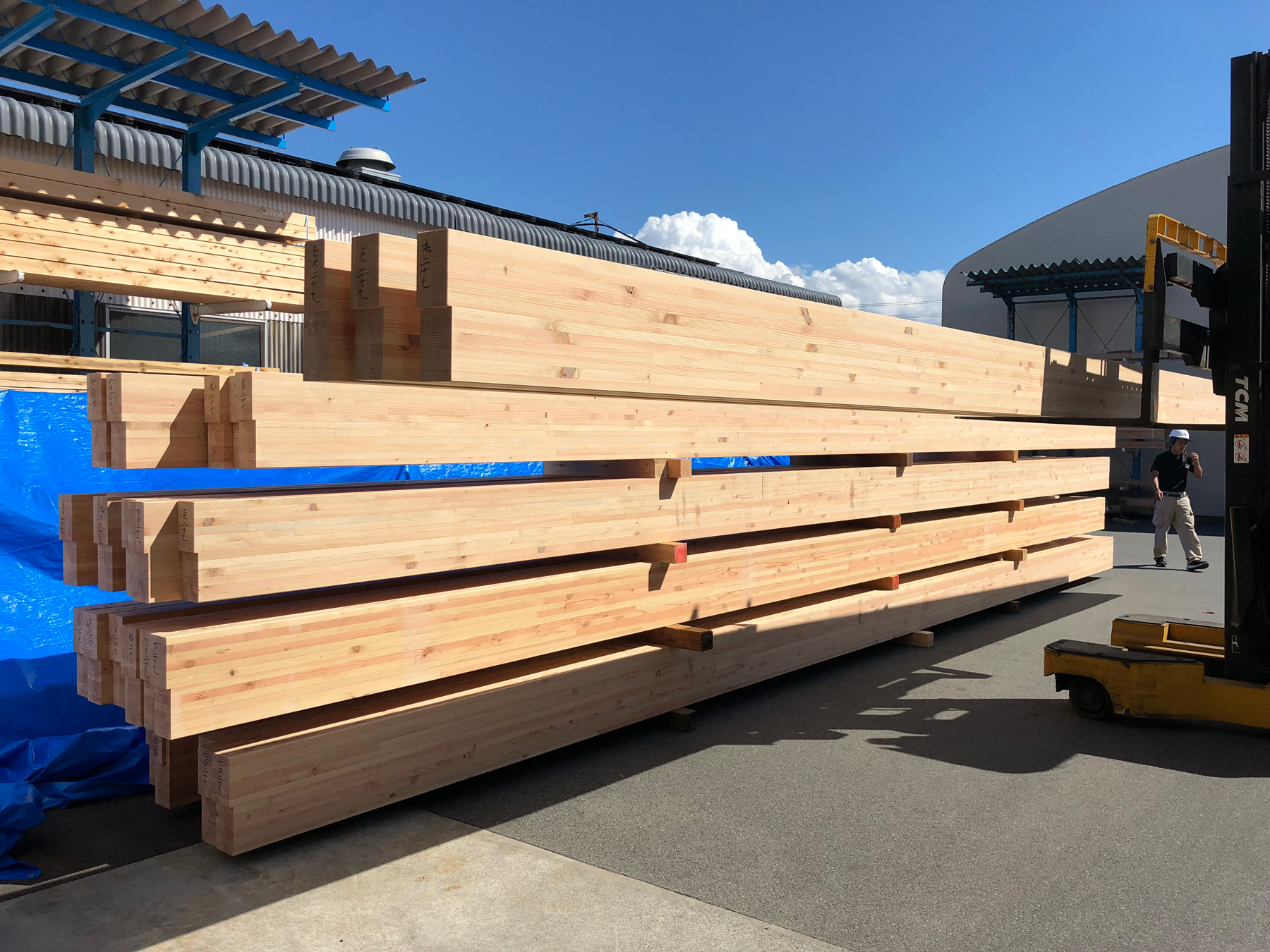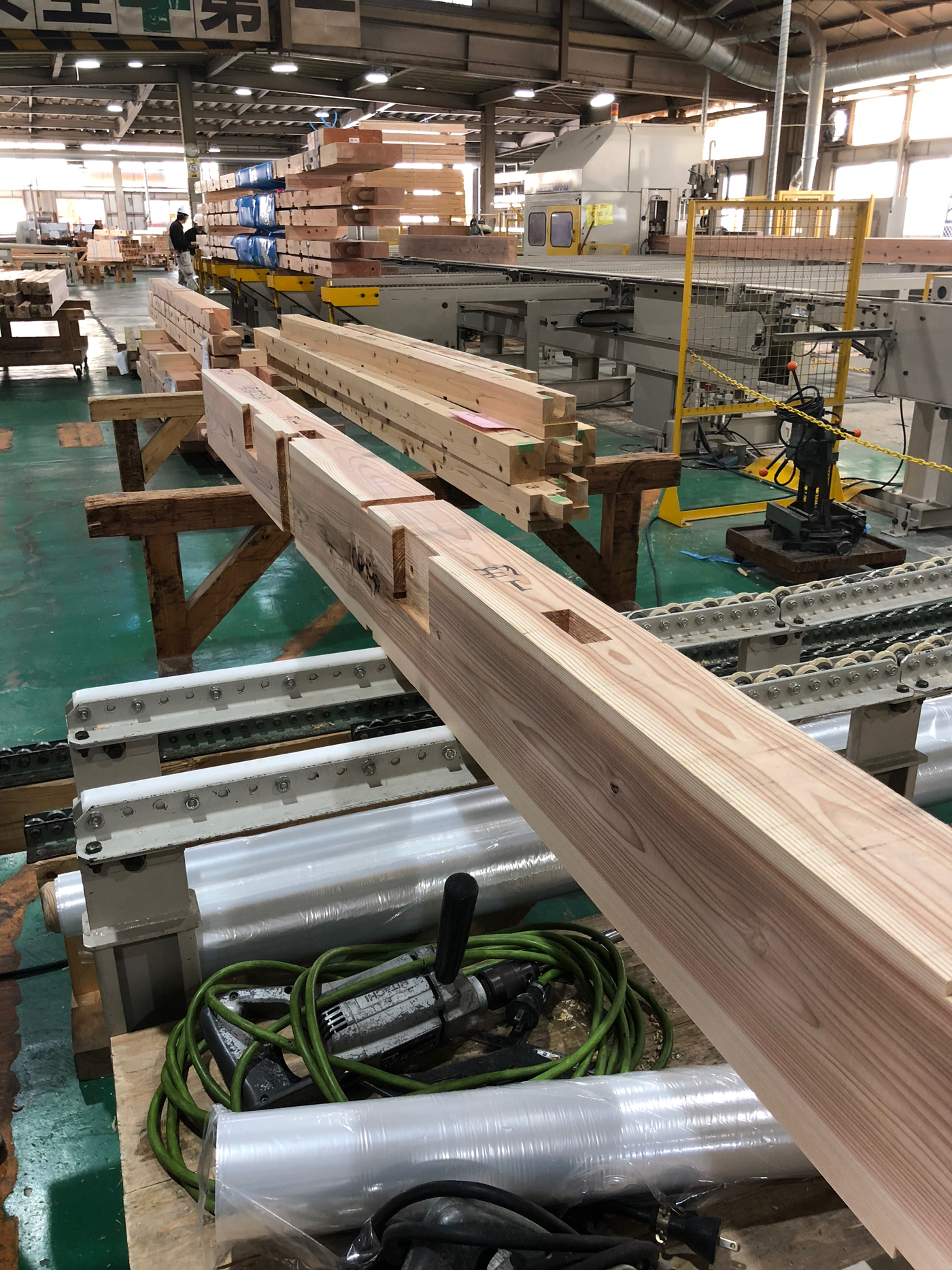今回プレカットを担当するのは、愛媛県の大手プレカット会社の「愛媛プレカット」さん。大きな敷地に効率よく機械が並べられ、流れ作業で加工が進んでいきます。