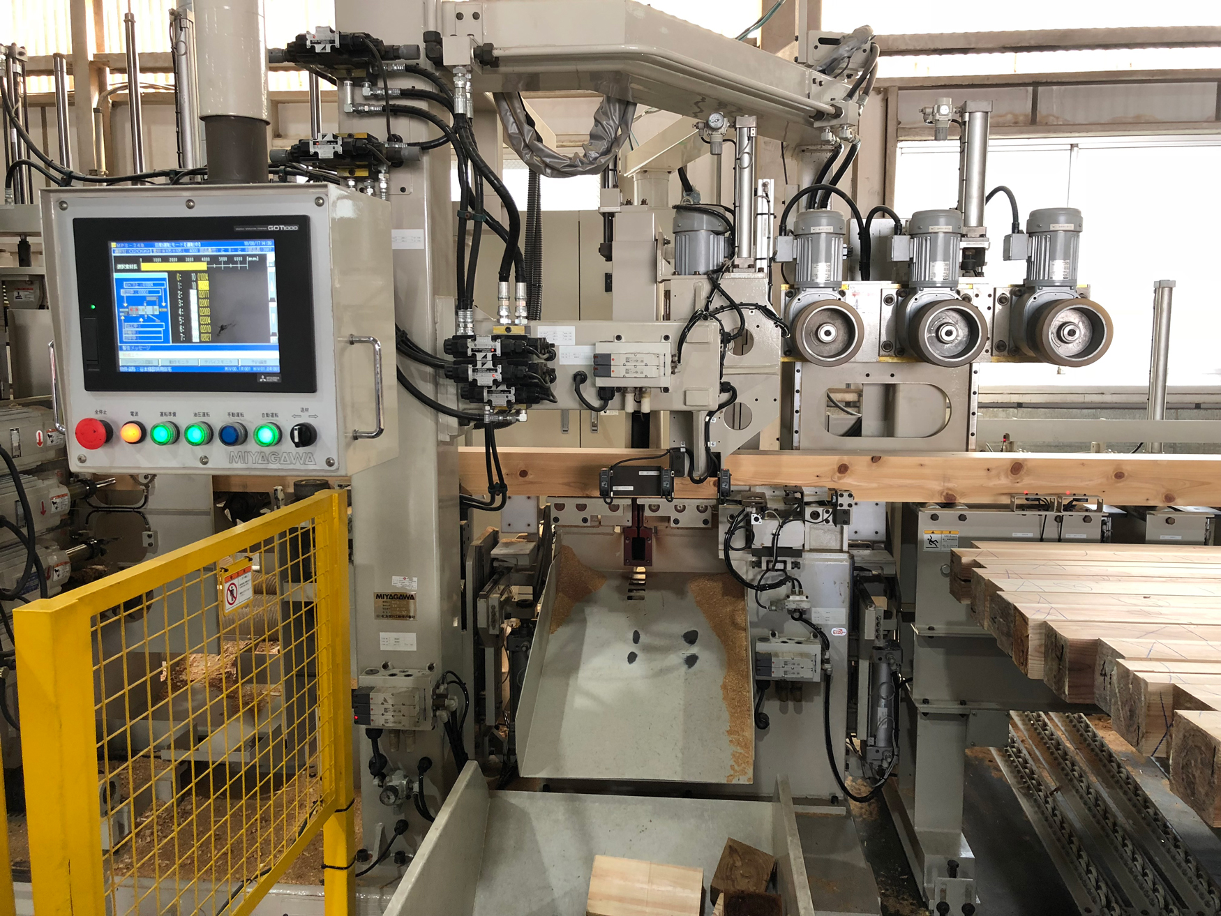 この機械は主に柱を加工するためのものです。柱と梁は加工の形状や木材の大きさが違うため、違うラインで加工されていきます。