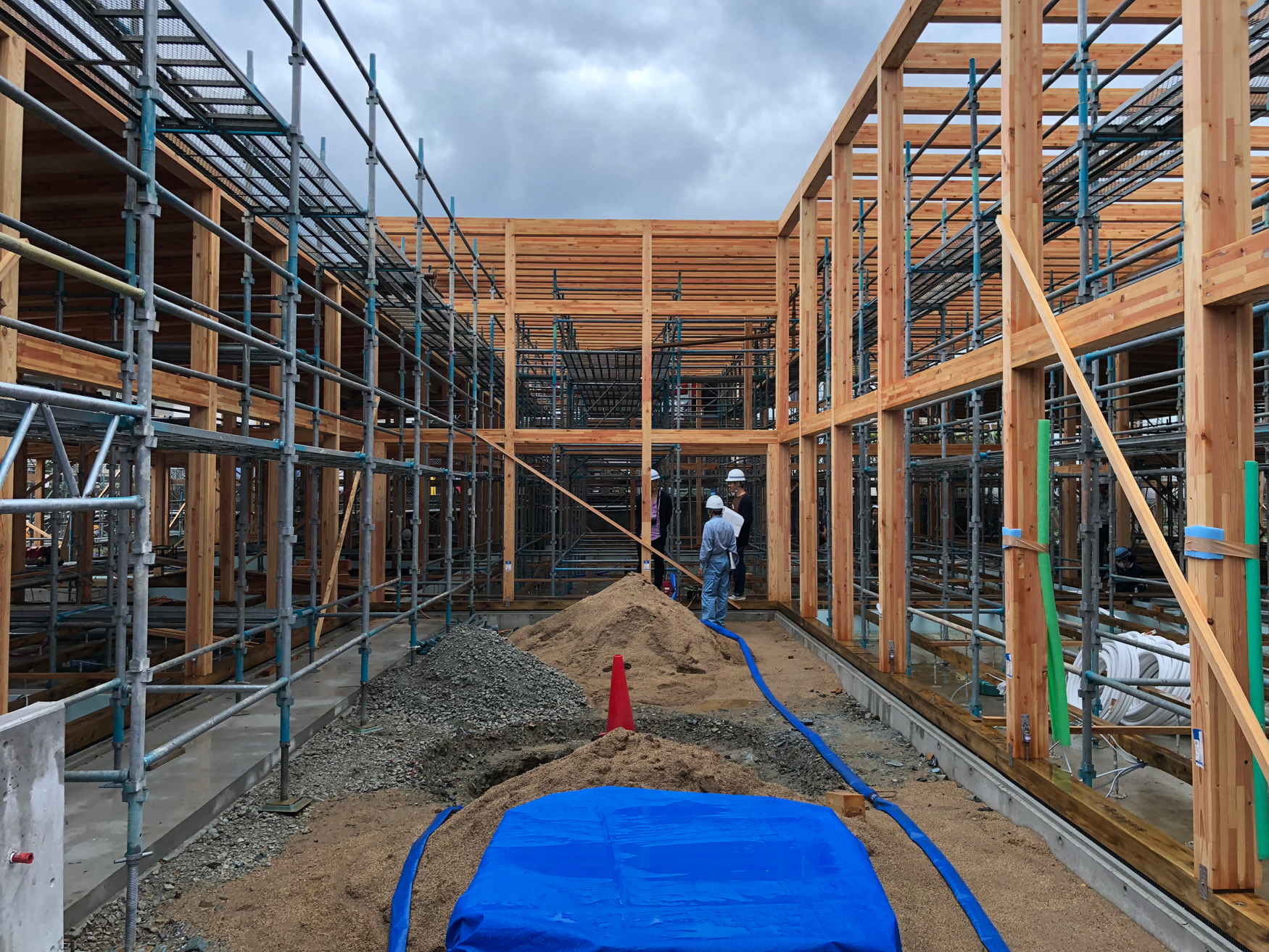 構造設計をお願いしている多田脩二さんと担当の深澤さんにもお越しいただき、細かく時間をかけてチェックをしていただきました。写真は保育園の中庭です。ほとんどの柱と梁が現しになるので慎重に確認をしました。